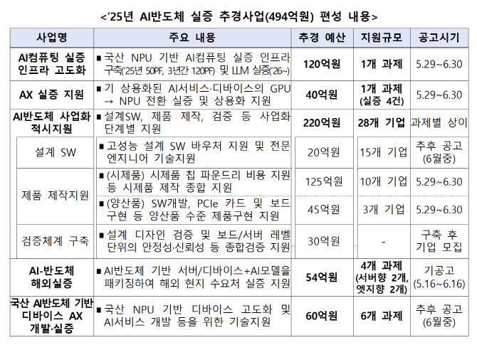 AI반도체 분야 추경 사업은 △AI컴퓨팅 실증 인프라 고도화(120억) △AX 실증 지원(40억) △AI반도체 사업화 적시 지원(220억) △AI-반도체 해외 실증 지원(54억) △국산 AI반도체 기반 디바이스 AX 개발·실증(60억) 사업으로 구성됐다.