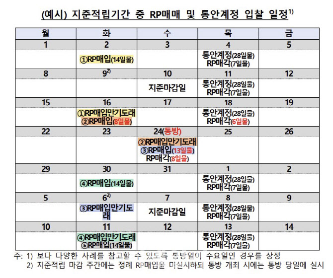 기존에 시행하던 매주 목요일 7일 만기 정례 RP매각(자금 흡수)은 유지하면서, 7월 10일부터는 매주 화요일에 14일짜리 RP 매입(자금 공급)도 정례적으로 실시한다. 정례 RP매각은 현재처럼 기준금리를 고정입찰금리로 하는 모집방식을 유지하지만, 정례 RP매입은 기준금리 이상을 최저입찰금리로 하는 복수금리 방식을 적용한다.
