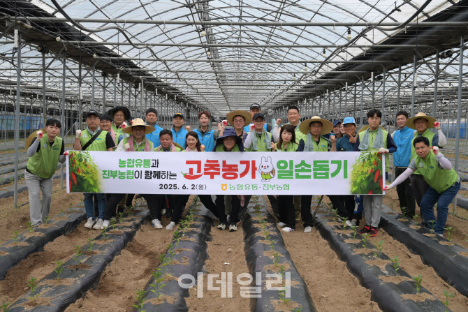 [이데일리 김태형 기자] 농협유통 임직원들이 2일 강원도 평창을 찾아 고추 지지대 세우기 봉사활동에 참여해 기념촬영을 하고 있다.