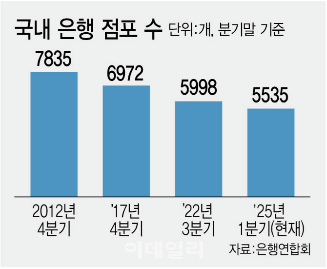 그럼에도 은행은 공동절차에 ‘도보생활권(반경 1㎞) 내의 점포 합병 등의 대해서는 미적용’이라는 조항을 이용해 인근 점포를 통폐합하는 방식으로 주민 의견 수렴을 피하고 있다. 국내 은행 점포 수는 빠른 속도로 감소하고 있다. 2012년 4분기 말 7835곳으로 정점을 찍은 후 2017년 4분기 말 6972곳으로 7000개를 밑돌았고 2022년 3분기 말에는 5998곳으로 6000개 밑으로 줄었다. 은행연합회에 따르면 올해 1분기 은행 점포 수는 직전 분기보다 90개 줄어든 5535개다. 지난해 108개의 은행 점포가 줄어든 것과 비교하면 은행 점포 폐쇄 속도가 매우 빨라졌다.