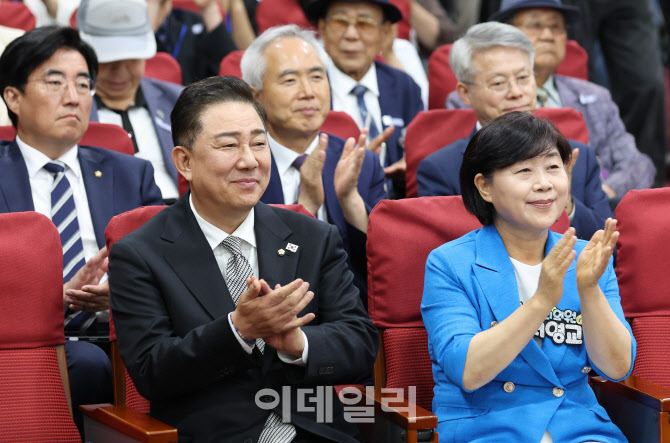 | | [이데일리 노진환 기자] 제22대 국회 더불어민주당 제2기 원내대표 후보자 합동토론회가 10일 오후 서울 여의도 국회 의원회관에서 열렸다. 원내대표 출마에 나선 김병기(왼쪽), 서영교 더불어민주당 의원이 참석자들의 발언을 들으며 박수를 치고 있다. |