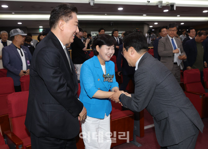 | | [이데일리 노진환 기자] 제22대 국회 더불어민주당 제2기 원내대표 후보자 합동토론회가 10일 오후 서울 여의도 국회 의원회관에서 열렸다. 원내대표 출마에 나선 김병기(왼쪽), 서영교 더불어민주당 의원이 박찬대 당대표 직무대행 겸 원내대표와 악수하고 있다. |