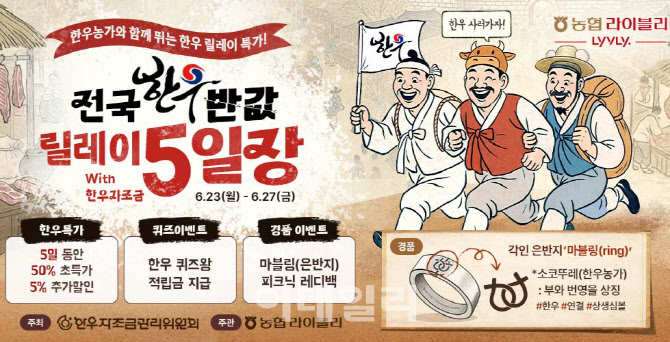 [이데일리 김태형 기자] 농협 경제지주(축산경제대표이사 안병우)가 운영하는 축산물 전문 온라인 쇼핑몰 농협 라이블리가 6월 27일까지 한우자조금관리위원회와 공동으로 「릴레이 5일장 할인전」을 진행한다.