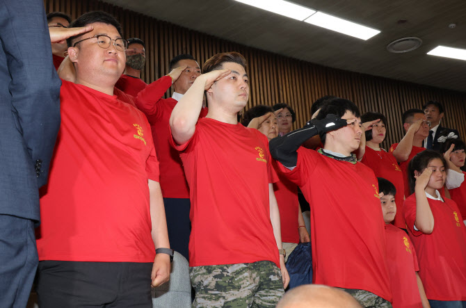 우원식 국회의장이 채 해병 특검법의 가결을 선포하자 이들은 기립해서 충성경례를 표했다. 일부 예비역은 뜨거운 감정을 드러내기도 했다.
