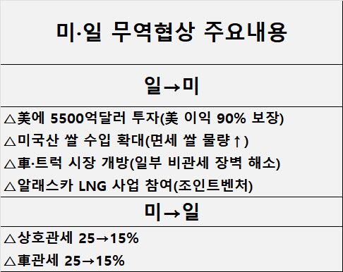천문학적인 대미 투자 약속과 함께 쌀 부족 상황에서도 지키려 했던 쌀 시장 일부 개방을 감수한 끝에 얻어낸 결과다. 일본은 정부계 금융기관이 5500억달러 규모의 자금을 조성해 일본 기업의 대미 투자에 대한 금융지원을 하기로 했다. 또 연 77만톤(t) 수준의 면세 쌀 수입 물량(MA)은 유지하되 미국산 비중을 늘리는 식으로 미국에 쌀 시장 개방이란 명분을 제공했다.