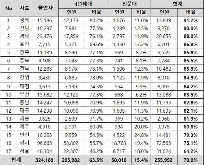 대학·전문대학 진학률 분석 결과 전국 17개 시도의 평균은 79%로 집계됐다. 시도별로는 경북이 91.2%로 가장 높았으며 전남 90%, 경남 88%, 울산 86.9%, 광주 85.8% 순으로 조사됐다.