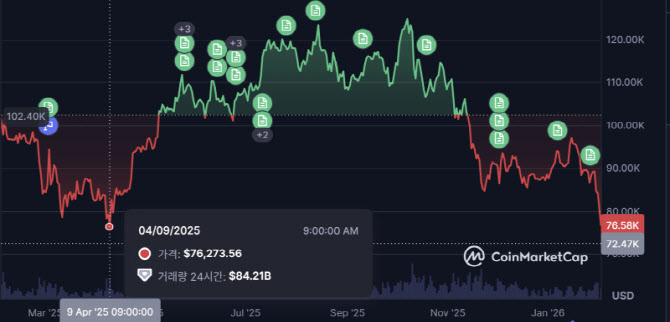 2일 코인마켓캡에 따르면 이날 오전 7시 현재 비트코인 가격은 24시간 전보다 2.26% 내린 7만6458달러 수준에서 거래되고 있다. 이는 작년 4월 이후 9개월여 만에 가장 낮은 수준이다. 앞서 전날 8만달러대가 붕괴된 뒤 비트코인은 꾸준히 하락세다.