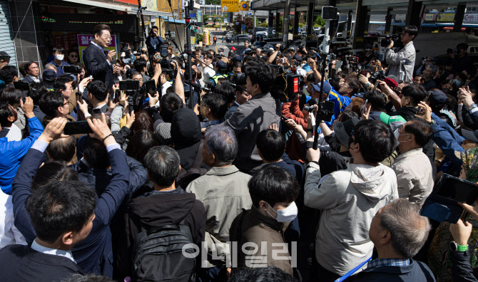 | | 경청투어에 나선 이재명 더불어민주당 대통령 후보가 10일 오전 경남 창녕군 창녕읍 창녕정기시장에 도착한 후 시민들을 향해 인사하고 있다.(사진=뉴스1) |