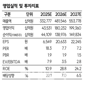 한 연구원은 “기존 예상을 상회하는 강력한 메모리 업황을 반영해 2026년 영업이익 180조원(전년 대비 314% 증가), 영업이익률 37%(전년 대비 27%포인트 증가)로 이익과 수익성 모두 사상 최대를 기록할 것”이라고 전망했다. 이는 시장 컨센서스 대비 영업이익은 32%, 영업이익률은 7%포인트 웃도는 수준이다.