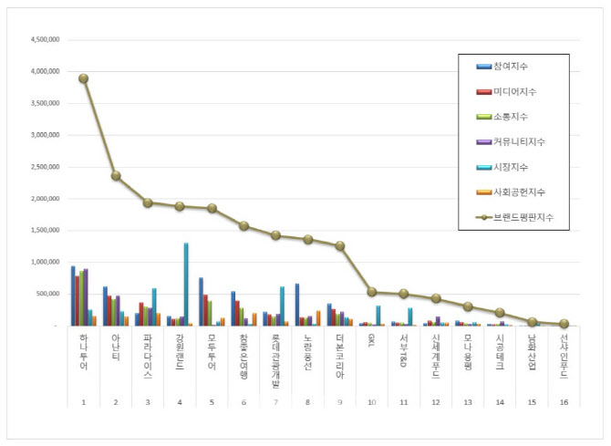 1위 하나투어는 참여지수 94만 3317, 미디어지수 78만 3637, 소통지수 85만 7322, 커뮤니티지수 89만 6852, 시장지수 25만 7748, 사회공헌지수 15만 6297을 기록하며 브랜드평판지수 389만 5174로 분석됐다. 11월 브랜드평판지수 485만 5042와 비교하면 19.77% 하락한 수치다.