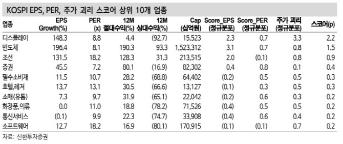 그 결과 상위권에는 디스플레이, 유통, 필수소비재, 호텔·레저, 화장품·의류, 통신서비스, 증권 등이 다수 포함됐다. 최근 1년간 EPS 개선 대비 주가 반영이 제한적이었던 업종들이다.