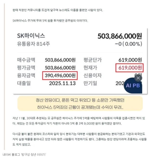 경제전문가 A씨는 최근 자신의 블로그를 통해 “지난해 11월 30대로 추정되는 공무원 B씨가 하이닉스 주가에 5억 원을 베팅하며 사람들의 이목을 집중시켰던 적이 있다”며 이같이 말했다.