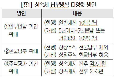 이에 대한상의는 현행 연부연납 제도를 개선해야 한다고 제언했다. 10년인 상속세 일반재산 연부연납 기간을 20년으로 늘리거나 최소 5년 거치 기간을 도입해야 한다는 것이다. 현재 상속세 납부세액이 총 2000만원을 초과하는 경우 적용되는 연부연납 제도는 현재 가업상속 중소·중견기업에만 최대 20년 분납 또는 10년 거치 후 10년 분납 혜택을 부여하고 있다. 반면 개인과 대기업은 거치 기간 없이 10년 분납만 허용한다.