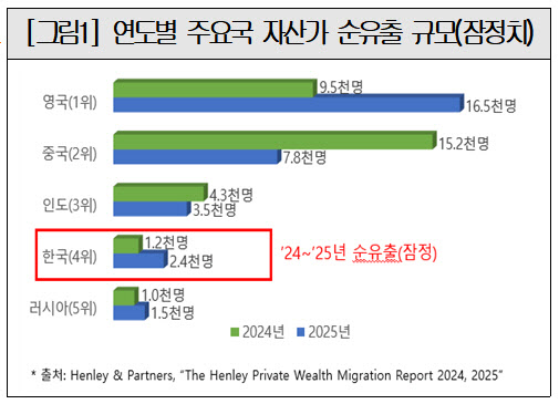 이로 인해 한국은 전 세계에서 부유층이 가장 많이 빠져나가는 국가 중 하나로 꼽힌다. 영국 이민 컨설팅사 헨리앤파트너스에 따르면 연간 한국 고액자산가 순유출 잠정치는 2024년 1200명에서 지난해 2400명으로 급증했다. 영국, 중국, 인도에 이어 세계 4위이다. 대한상의 관계자는 “50~60%에 달하는 상속세가 자본의 해외 이탈을 가속화하는 주된 요인”이라고 했다.