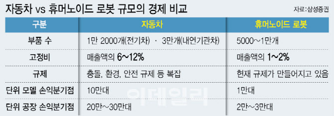 삼성증권 임은영 팀장은 “현대차·기아의 제조 원가 내의 인건비 비중은 7~8% 수준인데, 2028년 이후 휴머노이드 로봇 배치 속도에 따라 매해 1%포인트 수준의 원가 하락이 예상된다”며 “밸류 체인까지 확산 시 생산 원가는 50%로 하락할 것”이라고 긍정적인 전망을 내놓았다.