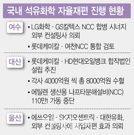 석화 사업 재편에서 가장 속도를 내는 곳은 대산이다. 롯데케미칼과 HD현대케미칼은 지난달 26일 공동으로 산업통상부에 사업재편계획 승인 심사를 신청한 이후 후속 작업을 진행하고 있다. 지난 5일에는 신한·NH농협·우리·IBK기업은행 등 채권단과 자율협의를 진행하기도 했다. 이 자리에서 롯데케미칼와 HD현대케미칼은 각각 4000억원 씩 총 8000억원의 유상증자로 자금을 수혈하는 방안을 제시한 것으로 전해진다. 채권단은 기존 부채 상환 연장과 신규 투자 자금 대출 등 금융 지원을 두고 고민하는 것으로 전해진다.