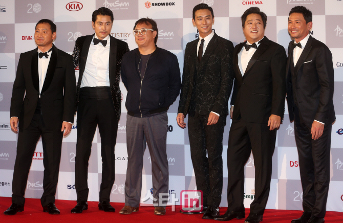 [부산=이데일리 스타in 김정욱 기자] 배우 정만식(왼쪽부터), 정우성, 김성수 감독, 배우 주지훈, 곽도원, 황정민이 1일 오후 부산 해운대구 영화의전당에서 열린 제20회 부산국제영화제 개막식에 참석해 레드카펫을 밟고 있다.