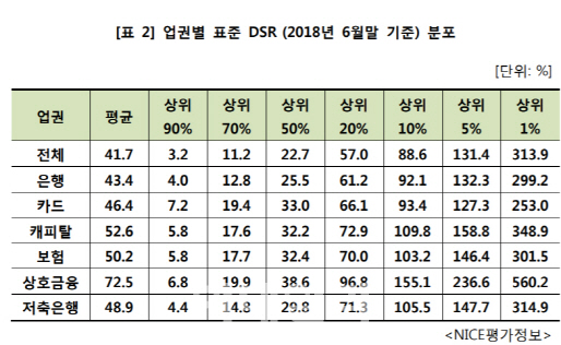 나이스평가정보 자료로 보면 DSR을 보면 상위 1%는 313.9%, 상위 5%는 131.4%, 상위 10%는 88.6%, 상위 20%는 57.0%로 나타났다. 업권별 평균 DSR을 살펴보면 상호금융이 72.5%로 가장 높았다. 다음으로 캐피탈 52.6%, 보험 50.2% 순이다.