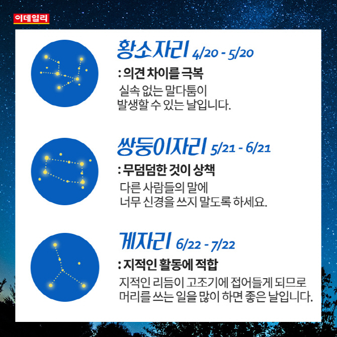△황소자리 : 실속 없는 말다툼이 발생할 수 있는 날입니다. 특히 중요한 결정을 내리려고 할 때마다 난관이 발생합니다. 다른 사람과 트러블을 일으킬 수 있는데 그러한 의견 차이를 제대로 극복할 수 있어야 합니다.
