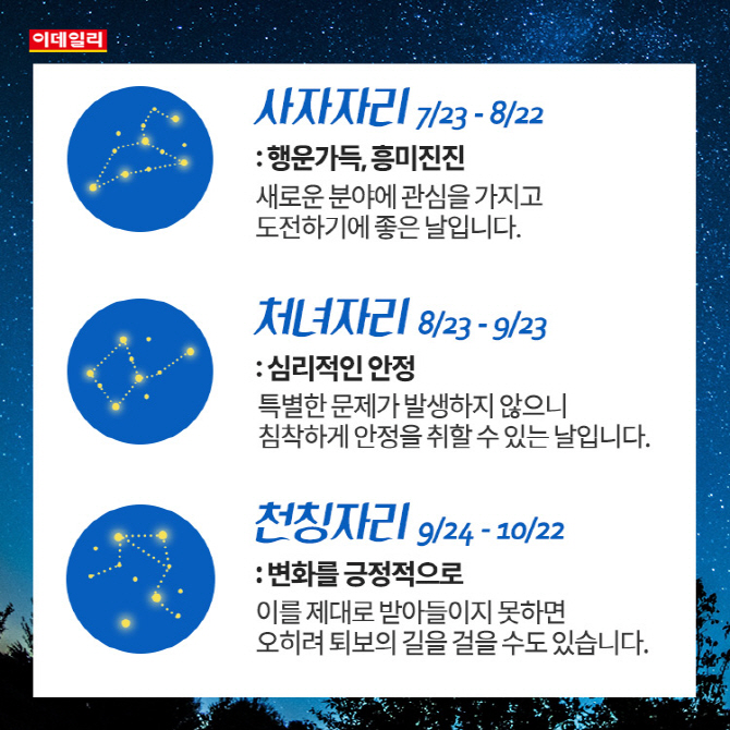 △사자자리 : 새로운 분야에 관심을 가지고 도전하기에 좋은 날입니다. 무엇에든 흥미진진한 느낌을 갖게 되며, 이렇게 시작하는 일에서는 행운이 따르게 되니 일석이조인 날입니다.