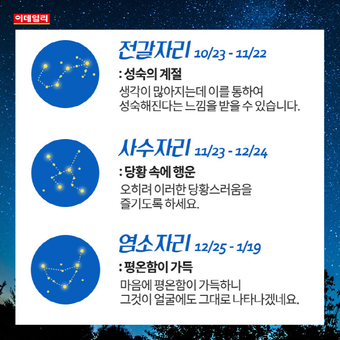 △천칭자리 : 극적인 변화가 생길 수 있는 날입니다. 약간 당황스러울 수 있지만 장기적으로 보았을 때 당신에게 꼭 필요한 변화일 수 있으니 받아들이셔야 합니다. 이를 제대로 받아들이지 못하면 오히려 퇴보의 길을 걸을 수도 있습니다.