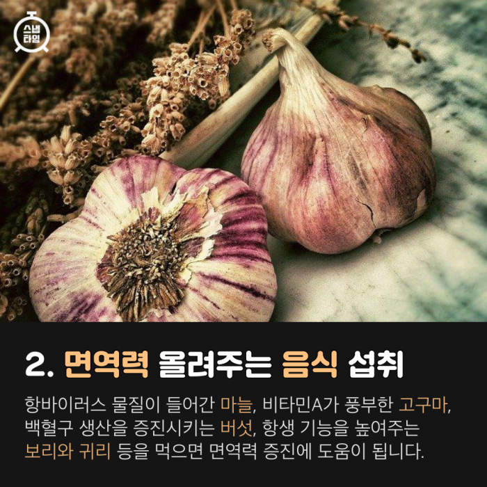 항바이러스 물질이 들어간 마늘, 비타민A가 풍부한 고구마, 백혈구 생산을 증진시키는 버섯, 항생 기능을 높여주는 보리와 귀리 등을 먹으면 면역력 증진에 도움이 됩니다.