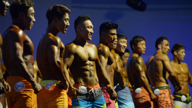 (서울=뉴스1) 17일 오전 서울 한강 세빛섬 FIC컨벤션에서 열린 '2016나바코리아 아시아 오픈 챔피언십(NABBA WFF KOREA ASIA OPEN CHAMPIONSHIP) 미스터 피지큐 28세 이상 숏 부문에 참가한 선수들이 포즈를 취하고 있다.