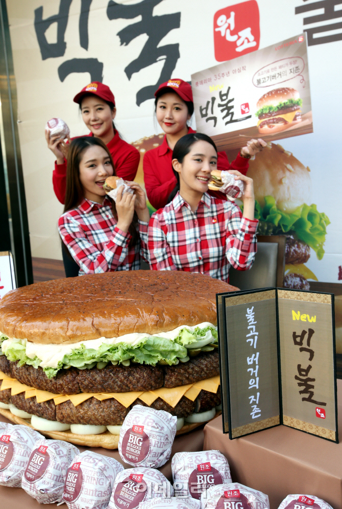 [이데일리 한대욱 기자] 롯데리아가 창립 35주년을 맞아 23일 서울 종로구 롯데리아 종각역점에서 불고기버거를 업그레이드한 '빅불'버거를 선보이고 있다.