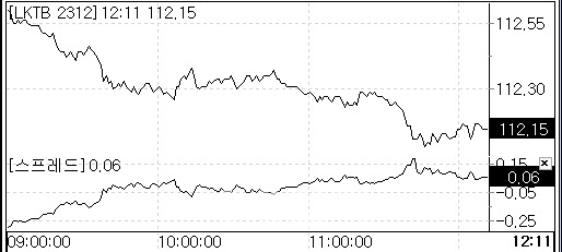 국채선물도 약세다. 3년 국채선물(KTB)은 전거래일 대비 5틱 내린 104.30에 거래되고 있다. 10년 국채선물(LKTB)도 5틱 내린 112.15에 거래 중이다.