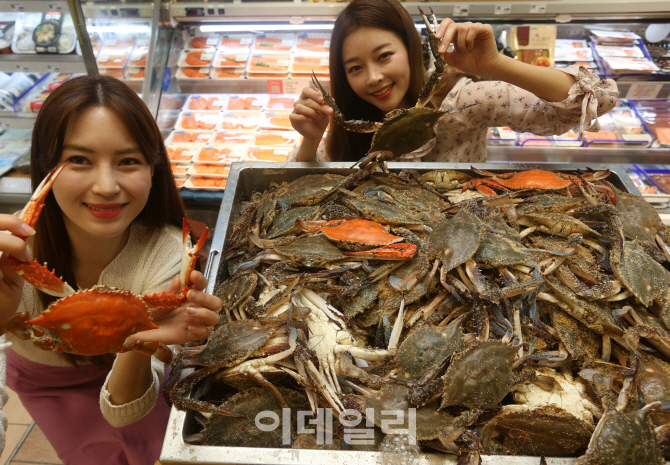 [이데일리 김태형 기자] 22일 서울 중구 롯데마트 서울역점에서 모델들이 서해안 햇꽃게를 선보이고 있다.