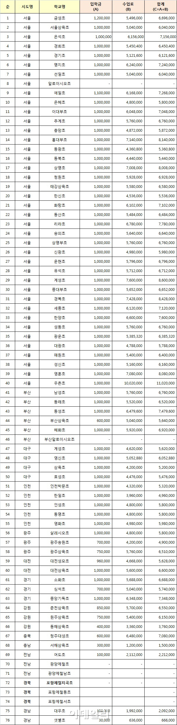 반면 천주교 재단이 운영하는 알로이시오초교 2곳(서울·부산)과 포스코 교육재단이 운영하는 제철초 5곳(포항·광양지역)은 재단이 지원금과 교육청 보조금 때문에 학생들이 부담하는 학비가 없는 것으로 조사됐다.