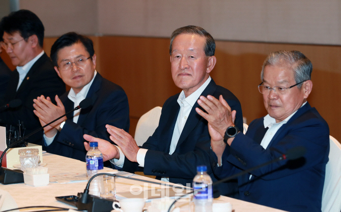 [이데일리 노진환 기자] 황교안(왼쪽 두번째) 자유한국당 대표와 허창수(오른쪽 두번째) 전경련 회장이 22일 오후 서울 여의도 전경련 회관에서 열린 ‘자유한국당-전국경제인연합회 정책간담회’에서 박수를 치고 있다.