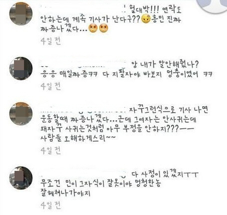 또 다른 지인은 “그럼 그 여자(민아) 소속사는 왜 부정은 안하지?”라며 불만을 표시했고 길 씨는 “사정이 있을 것”이라고 답했다.