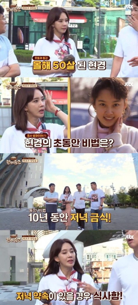 이날 강호동은 “오현경에 대한 진실이 궁금하다. 오현경의 지금 나이가 50세다. 50대가 됐는데도 예전과 변함이 없다”며 “들은 소문으로는 10년 동안 저녁을 안 먹었다는데 사실이냐. 비결이 뭐냐”고 물었다.
