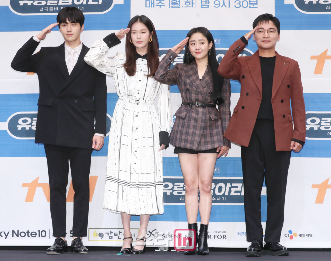 [이데일리 스타in 이영훈 기자] 배우 김선호(왼쪽부터)와 정유진, 문근영, 조재윤이 21일 오후 서울 구로구 신도림동 라마다호텔에서 열린 케이블 채널 tvN 월화 드라마 ‘유령을 잡아라’(감독 신윤섭) 제작발표회에 참석해 포즈를 취하고 있다.