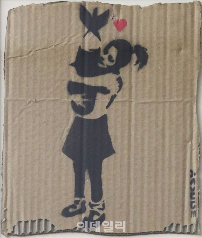‘폭탄을 안은 소녀’(Bomb Hugger·2015)는 그의 이른바 ‘폭탄시리즈’ ‘소녀시리즈’ 중 한 점이다. 골판지에 스텐실(판에 구멍을 뚫고 잉크를 통과시켜 찍어내는 공판화 기법)로 제작한 작품은 뱅크시의 역설을 적나라하게 보여주는데. 던져버려야 할 폭탄은 품고, 품어야 할 꽃다발은 던져버리는(대표작 ‘꽃을 던지는 사람’) 극적인 반전 말이다. 그 상황에도 놓치지 않는 ‘발랄한 위트’는 덤이다. 빨간 하트가 별처럼 빛난다.