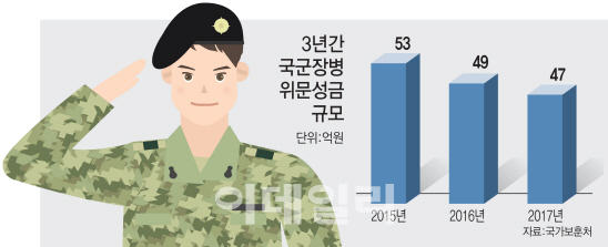 최근 3년간 위문성금 규모는 △2015년 약 53억원 △2016년 약 49억원 △2017년 약 47억원으로 50억원 안팎 수준을 유지하고 있다. 통상 매해 10~12월 중 기관별 자율모금 방식으로 희망자에 한해 급여의 0.3~0.4%를 공제하고 있다. 공공기관에서 근무하는 A씨는 “소액이지만 내가 낸 돈이 추운 날씨에 고생하는 국군 장병에게 도움이 된다 생각해 흔쾌히 모금에 참여했다”라며 “국가를 위해 청춘을 바치는 젊은 친구들에게 조금이라도 더 혜택이 갔으면 좋겠다는 마음에서다”고 밝혔다.